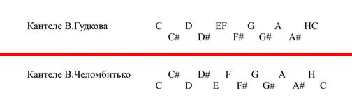 Пытаясь улучшить и развить кантеле, В.Челомбитько достаточно смело экспериментировал. Он расширил диапазон инструмента, изменил расположение струн. В кантеле конструкции Гудкова промежутки между основными верхними струнами были неравными (например, промежутки между струнами е-f и h-c были уже всех остальных). Верхний ряд струн соответствует белым клавишам фортепиано, а нижний – черным. В новом расположении струн инструмента Челомбитько промежутки были равными. В его инструменте струны располагаются по очереди (см. схему). Диапазон кантеле примы от h до g3, пикколо – от c2 до c4.