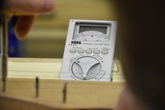 Последняя струна натянута… Кантеле готово! Теперь можно настраивать на нужный мажорный тон… Помогает в этом г-ну консулу тюнер и мастер по изготовлению музыкальных инструментов ансамбля «Кантеле» Андрей Смолин.